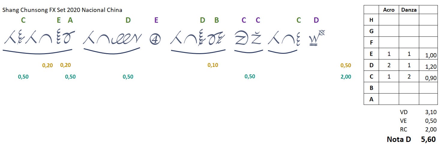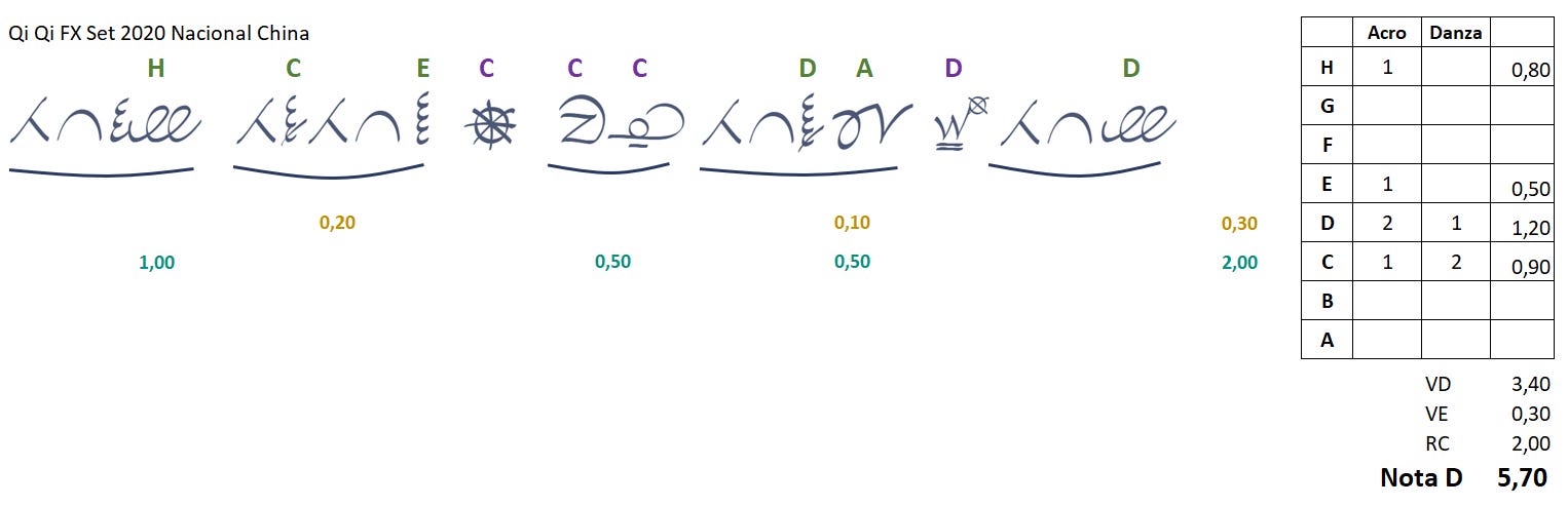 Fue la rutina favorita de la semana y le consiguió un lugar entre las aspirantes al podio de viga en Tokyo. Clasificó en primer lugar, y no es para menos: 7.10 de nota de dificultad, la más alta en lo que va del ciclo. Emily de FlipFlyTumble descubrió que Chenchen subió 2 puntos enteros de nota D (de 5.1 a 7.1) desde el mundial junior de 2019 hasta ahora.