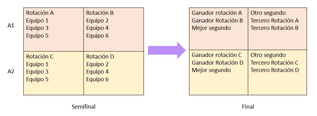 Los mejores 6 de A1 y de A2 compiten en el Final Six en 4 rotaciones de 3 equipos cada una en formato duelo 1 a 1. Se compone de 2 días de competencia: Semifinal y Final.