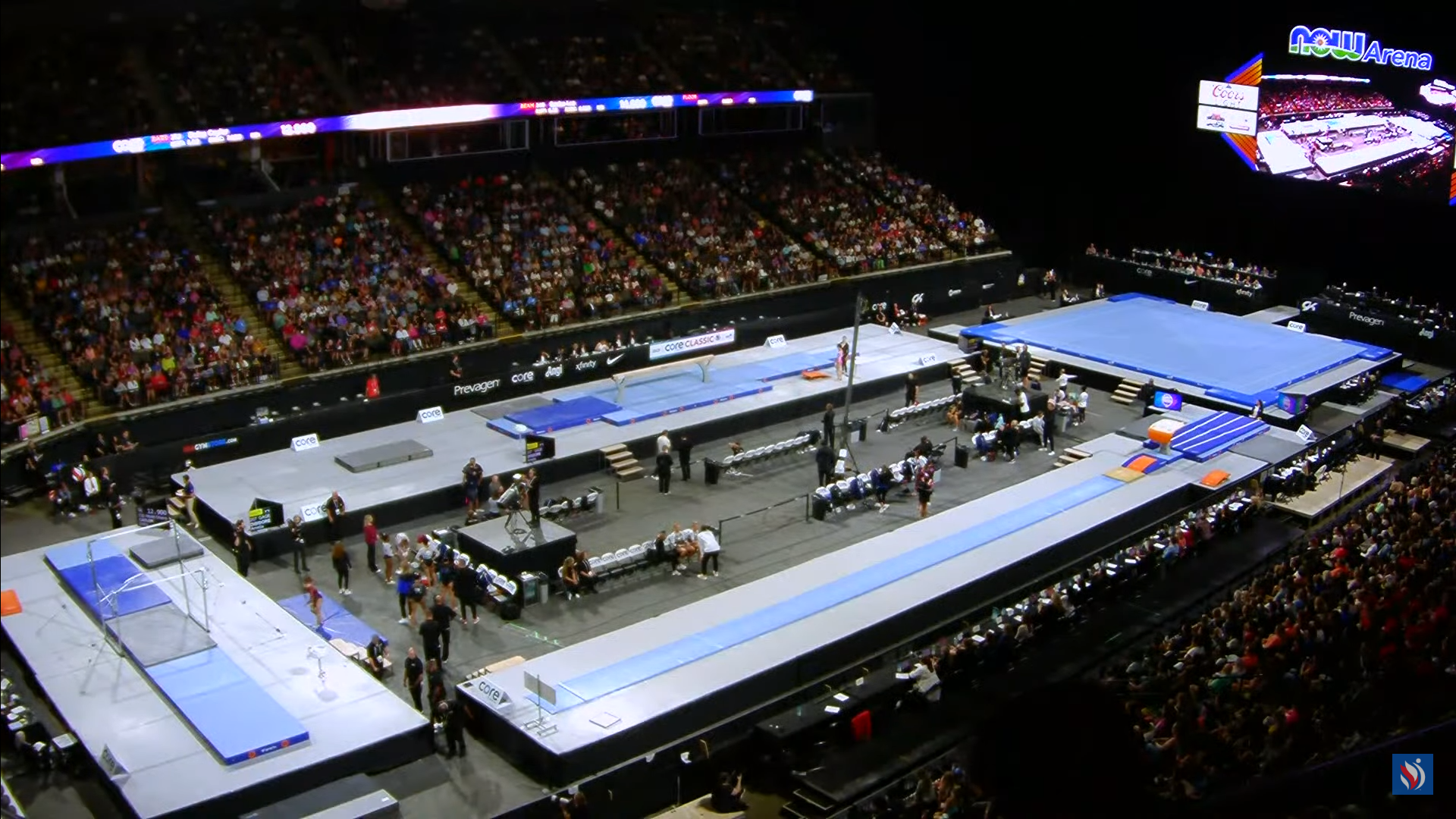 Naturalmente, me tocó el feed internacional de YouTube de USAG. Tenía mucha toma aérea y por alguna razón no me cuadraba el podio. Dejaron un espacio en el medio para las cámaras, el podio de viga era desproporcionado para los aparatos de femenina (seguramente previendo armado y desarmado rápido de masculina) y algo en general no me cuadró.