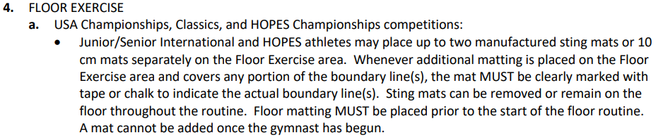 En términos absolutos, hay dos recaudos para tomar. El primero es que en los torneos domésticos hay reglas diferentes para colchonetas suplementarias. Las aprovechan todas las gimnastas, pero en un torneo FIG llevarían deducción neutral. Esta es la que aplica a Elite: