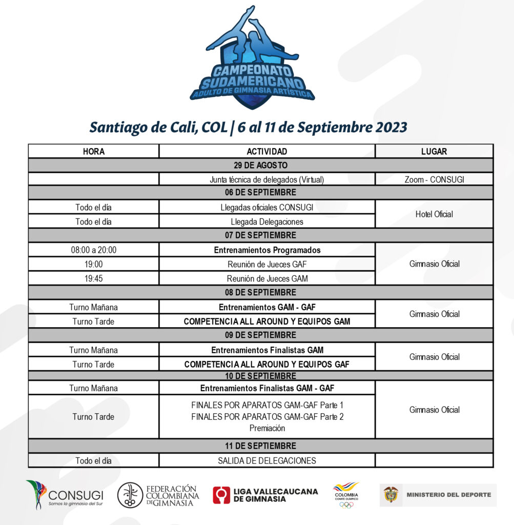 El Sudamericano 2023 de la categoría senior se realizará del 6 al 11 de setiembre en Cali, Colombia. En breve estará disponible la lista de gimnastas y los horarios de transmisión en este link.