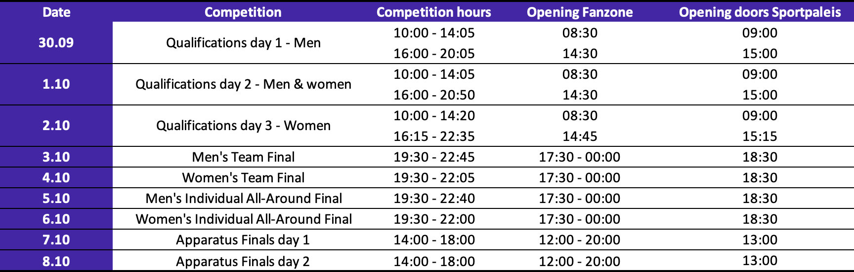 Los amigues de Amberes usan Excel con cabezales violetas, como yo, y nos dejaron este bello gráfico con días y horarios generales. La zona horaria es GMT+2 (Uruguay y Argentina son -3, para referencia). Femenina arranca el domingo a las 11:00 UY/ARG, 09:00 CDMX.