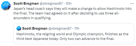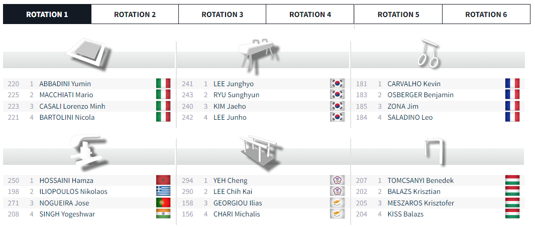 Japón lidera el AA con sus tres gimnastas, pero sorpresivamente Hashimoto Daiki quedó en tercer lugar y por lo tanto no clasificó a la final del martes. Sin embargo, el head coach confirmó que van a hacer los cambios necesarios para que pueda entrar (es decir, bajar a un compañero) y que fue una decisión con la que todo el equipo está de acuerdo.