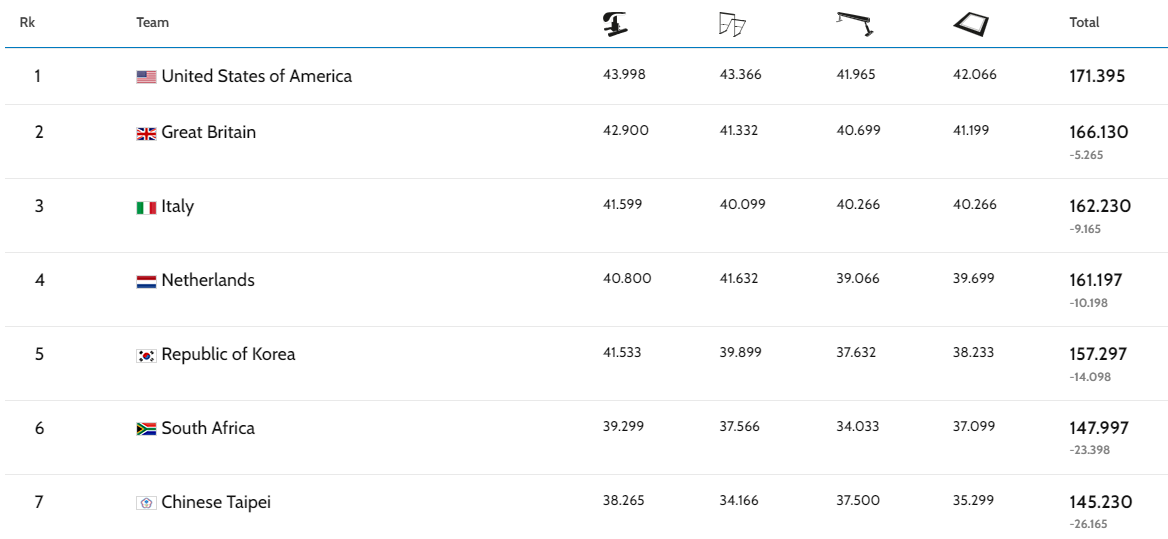 Corea del Sur, rival directo de los países latinoamericanos, no tuvo el mejor puntaje en viga y quedó un poco abajo para ser considerado para París.