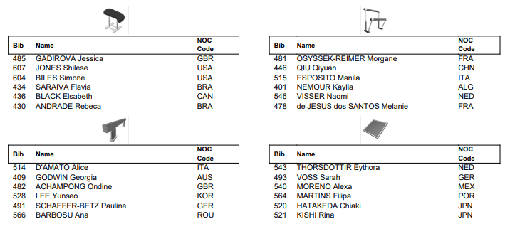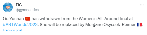 La FIG confirmó esta tarde que la gimnasta Ou Yushan (CHN) se bajó de la final all-around y será reemplazada por Morganne Ossysek-Reimer (FRA). La gimnasta había clasificado en el noveno lugar con 54.632, mientras que Ossysek-Reimer ganó ayer el bronce por equipos en su primer mundial como titular.